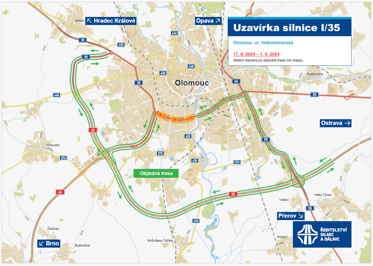 Ředitelství silnic a dálnic sděluje, že v termínu od 17.8. do 1.9.2024, bude obousměrně uzavřena ul. Velkomoravská, v úseku od křížení ulic Albertova X Brněnská po odbočení do Galerie Šantovka z důvodu rekonstrukce silnice. Zhotovitel dojednal objízdné trasy vedené po dálnici D35 (zdarma).
