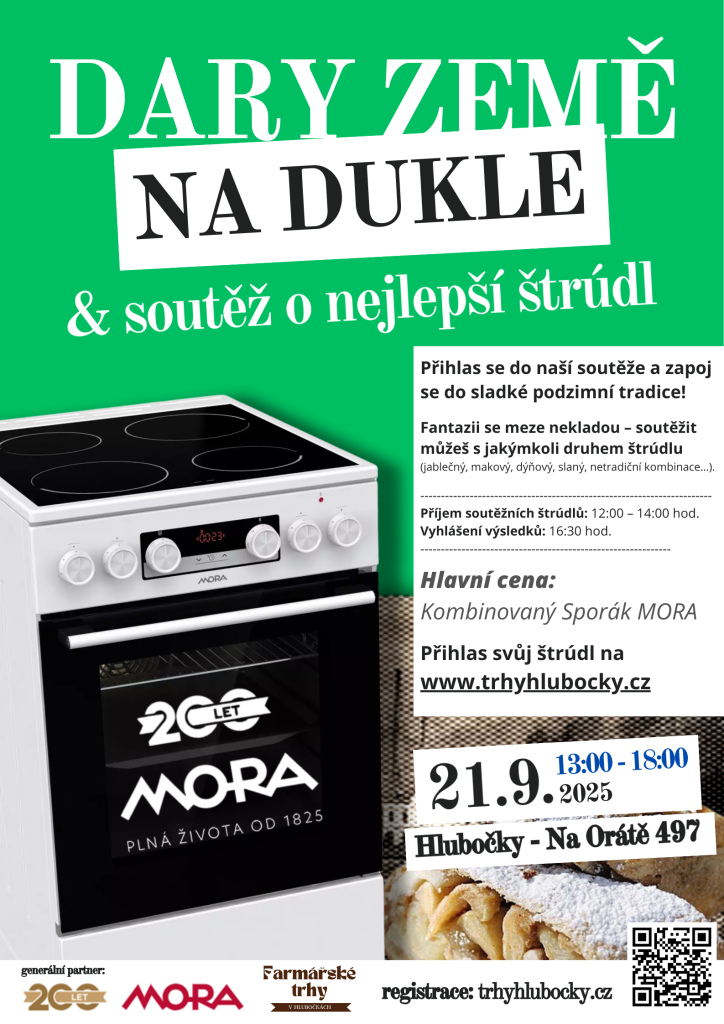 Dary země na Dukle se uskuteční v neděli 21. září 2025 od 13:00 do 18:00 na sídlišti Dukla v Hlubočkách (Na Orátě 497).Součástí akce je také soutěž o nejlepší štrúdl MORA MORAVIA.