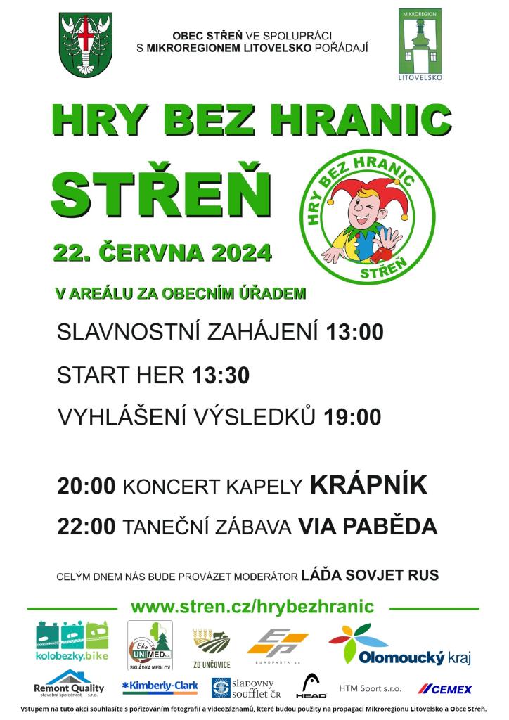 Hry bez hranic Mikroregionu Litovelsko (Střeň, sobota 22. června). Vstup je zdarma, včetně večerního programu (koncert kapely Krápník a taneční zábava Via Paběda).