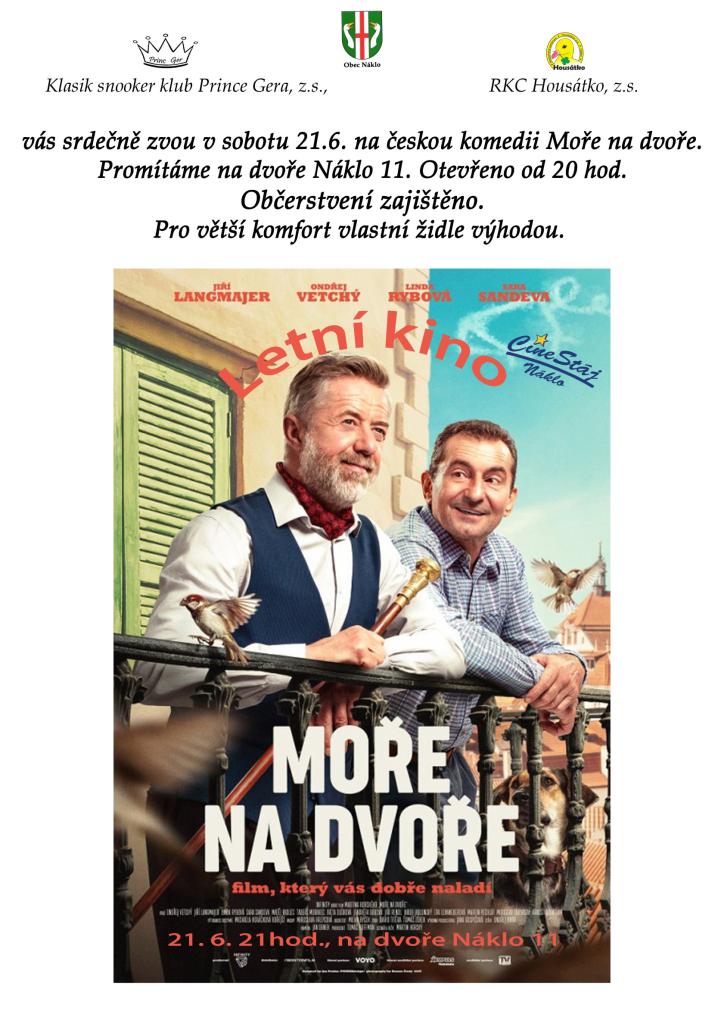 Klasik snooker klub Prince Gera, z.s. a RKC Housátko, z.s. zvou v sobotu 21.6.2025 na českou komedii Moře na dvoře, promítání na dvoře Náklo 11.