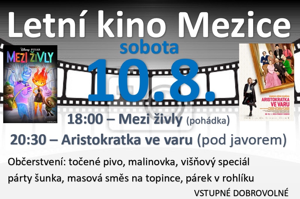 Letní kino Mezice sobota 10.8.2024 od 18.00 hod. Mezi živly od 20.30 hod. Aristokratka ve varu