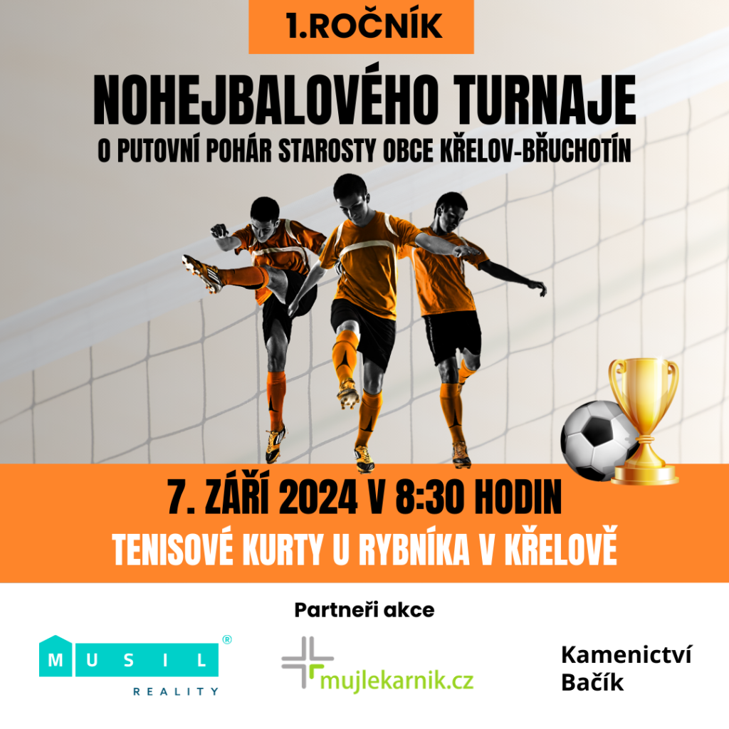V obci Křelov-Břuchotín se dne 07.09.2024 bude konat nohejbalový turnaj na tenisových kurtech u rybníka v Křelově.