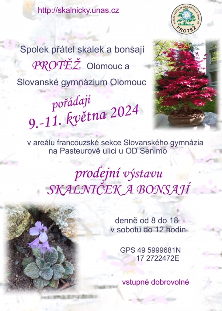 Spolek přátel skalek a bonsají PROTĚŽ Olomouc a Slovanské gymnázium Olomouc pořádají 9. - 11. 5. 2024 prodejní výstavu skalniček a bonsají.